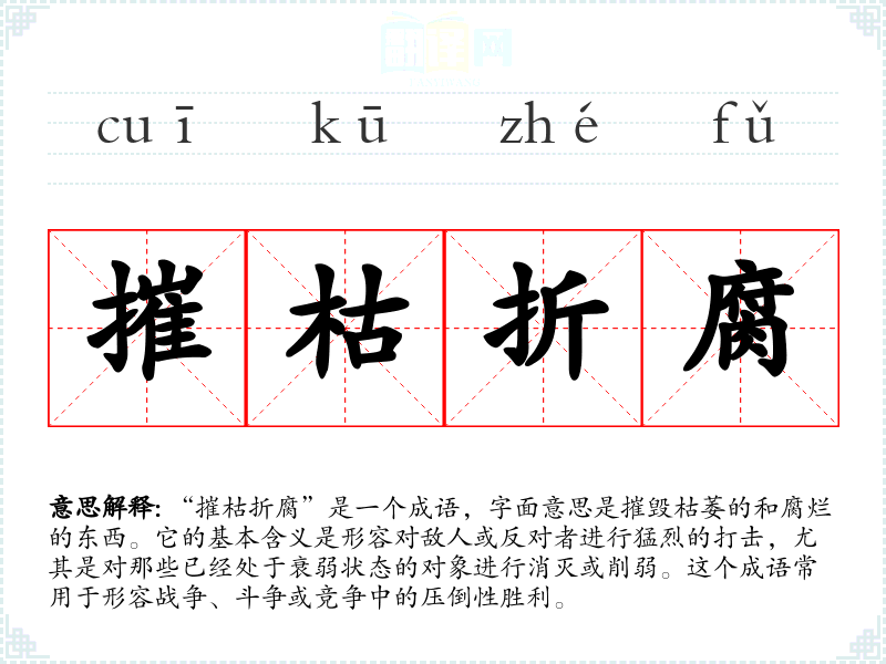 “摧枯折腐”是一个成语,字面意思是摧毁枯萎的和腐烂的东西。它的基本含义是形容对敌人或反对者进行猛烈的打击,尤其是对那些已经处于衰弱状态的对象进行消灭或削弱。这个成语常用于形容战争、斗争或竞争中的压倒性胜利。