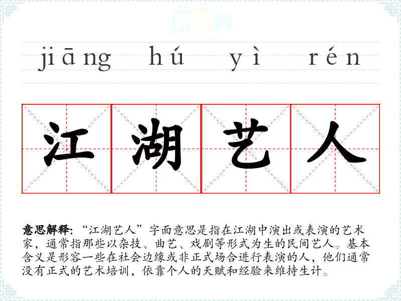 “江湖艺人”字面意思是指在江湖中演出或表演的艺术家,通常指那些以杂技、曲艺、戏剧等形式为生的民间艺人。基本含义是形容一些在社会边缘或非正式场合进行表演的人,他们通常没有正式的艺术培训,依靠个人的天赋和经验来维持生计。