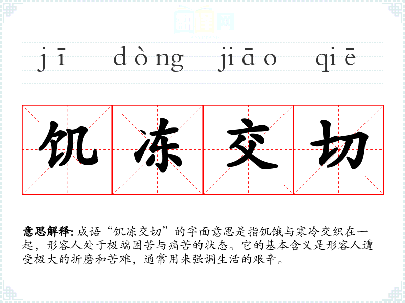 成语“饥冻交切”的字面意思是指饥饿与寒冷交织在一起,形容人处于极端困苦与痛苦的状态。它的基本含义是形容人遭受极大的折磨和苦难,通常用来强调生活的艰辛。