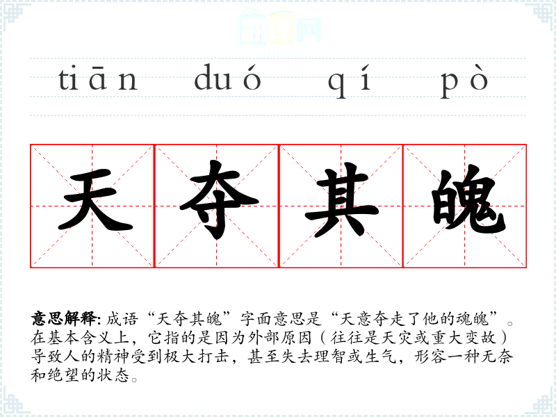 成语“天夺其魄”字面意思是“天意夺走了他的魂魄”。在基本含义上,它指的是因为外部原因(往往是天灾或重大变故)导致人的精神受到极大打击,甚至失去理智或生气,形容一种无奈和绝望的状态。