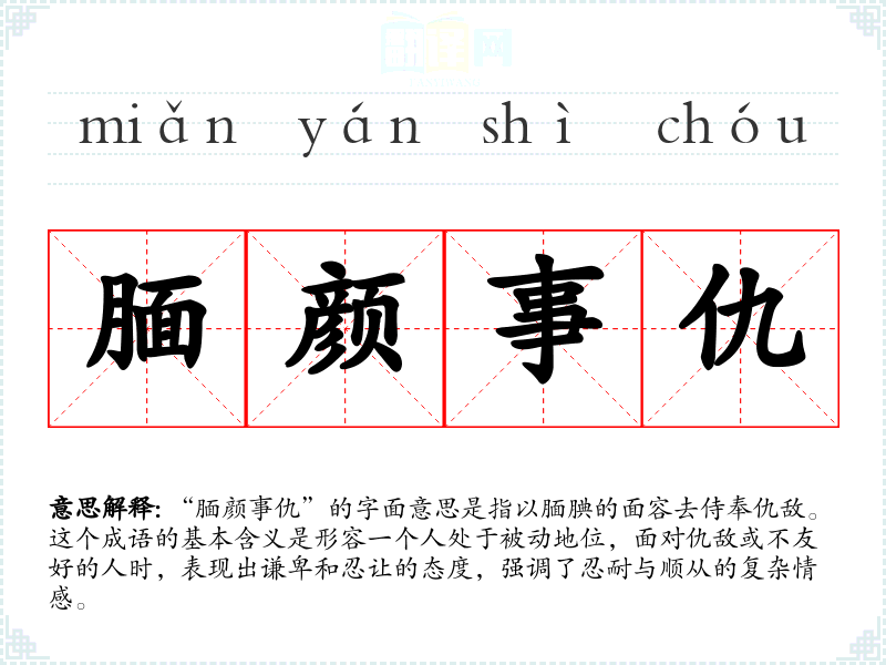 该成语出自《史记·平原君赵胜传》,原文是“腼颜事仇,非其所愿”,表现出对敌人的一种无奈的态度。这个成语反映了古代社会中人们在面对敌对关系时的无奈与忍让,反映了一种策略上的妥协。