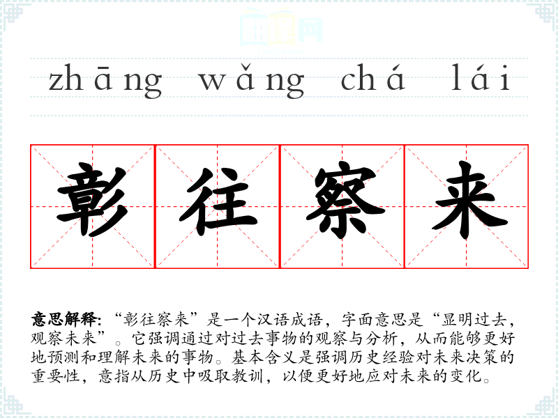 该成语常用于历史研究、政治分析、商业决策、教育讲座等场合。在文学作品中,它可以用来描绘人物的智慧与远见;在日常对话中,可以用来提醒他人重视历史教训。例如,在讨论社会问题时,可以提到“彰往察来”的重要性,以强调历史对当今社会的启示。