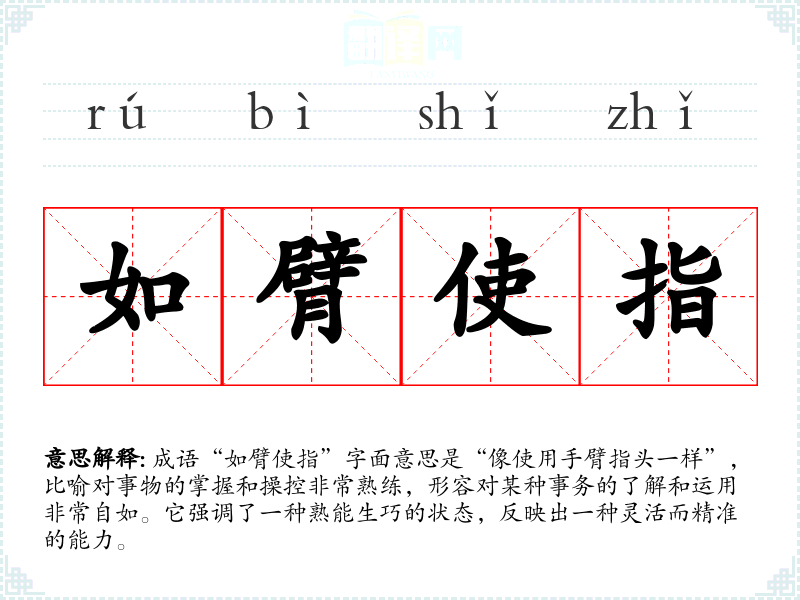 成语“如臂使指”字面意思是“像使用手臂指头一样”,比喻对事物的掌握和操控非常熟练,形容对某种事务的了解和运用非常自如。它强调了一种熟能生巧的状态,反映出一种灵活而精准的能力。