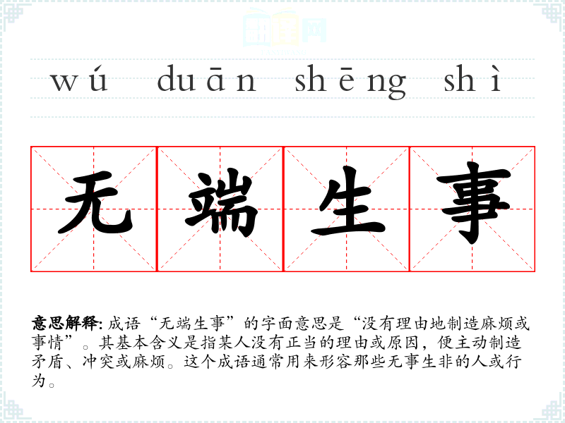 成语“无端生事”的字面意思是“没有理由地制造麻烦或事情”。其基本含义是指某人没有正当的理由或原因,便主动制造矛盾、冲突或麻烦。这个成语通常用来形容那些无事生非的人或行为。