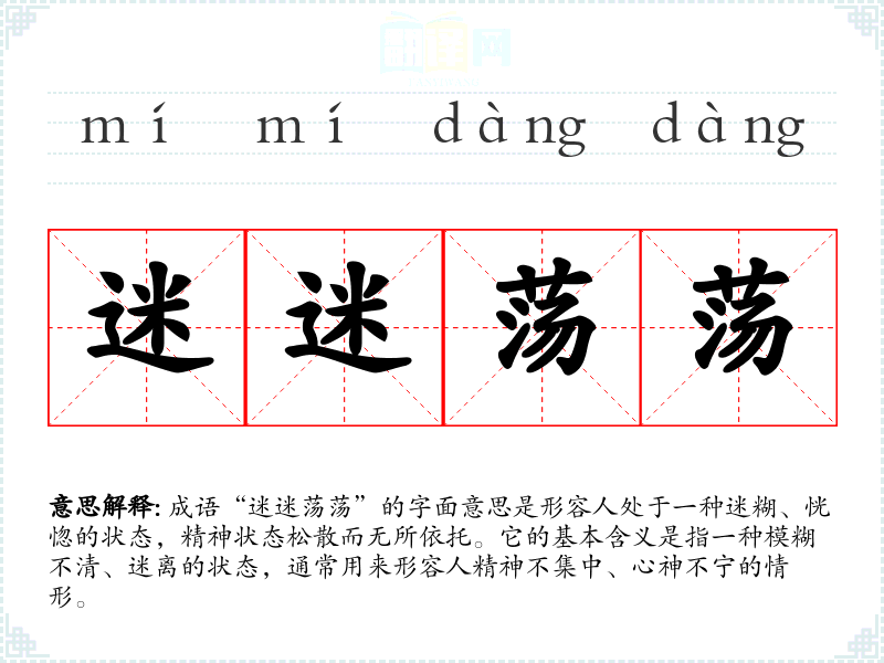成语“迷迷荡荡”的字面意思是形容人处于一种迷糊、恍惚的状态,精神状态松散而无所依托。它的基本含义是指一种模糊不清、迷离的状态,通常用来形容人精神不集中、心神不宁的情形。