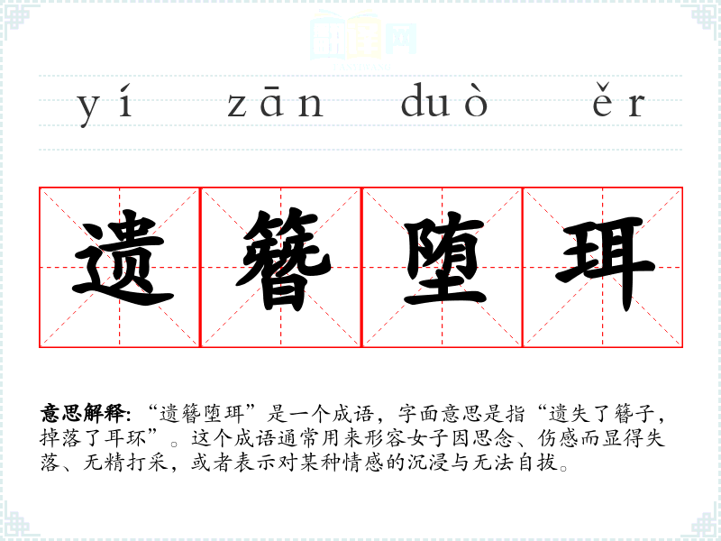在英语中,类似的表达可以是“lost in thought”或“heartbroken”,但它们的文化背景和情感细腻度与“遗簪堕珥”还是有所不同。后者更强调具体的物品和情感的结合,使得情感更加具体和生动。