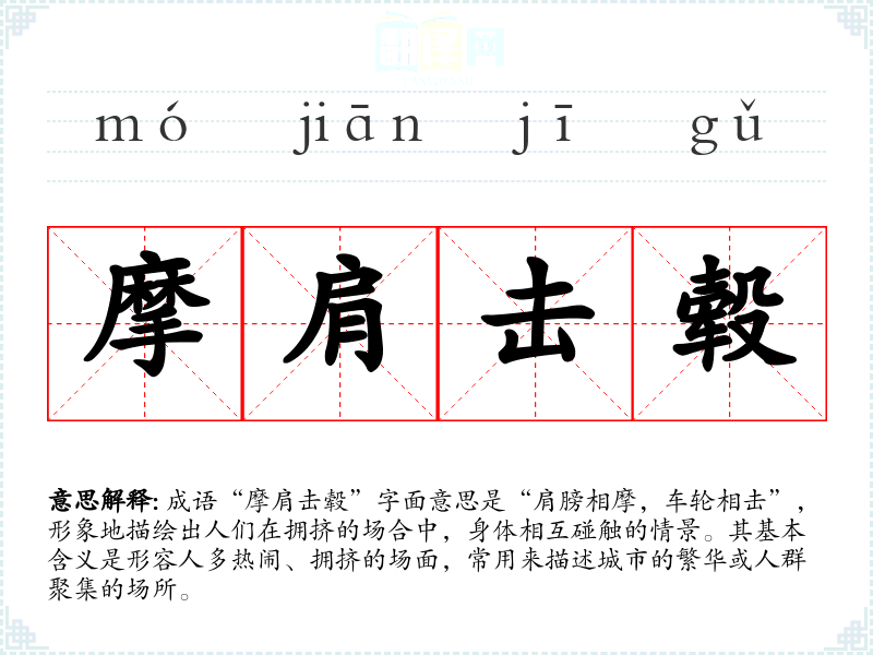 成语“摩肩击毂”字面意思是“肩膀相摩,车轮相击”,形象地描绘出人们在拥挤的场合中,身体相互碰触的情景。其基本含义是形容人多热闹、拥挤的场面,常用来描述城市的繁华或人群聚集的场所。