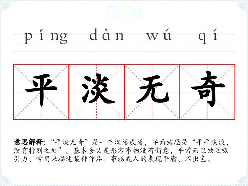 “平淡无奇”是一个汉语成语,字面意思是“平平淡淡,没有特别之处”。基本含义是形容事物没有新意,平常而且缺乏吸引力,常用来描述某种作品、事物或人的表现平庸、不出色。