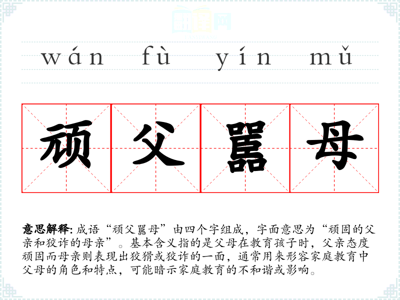 成语“顽父嚚母”由四个字组成,字面意思为“顽固的父亲和狡诈的母亲”。基本含义指的是父母在教育孩子时,父亲态度顽固而母亲则表现出狡猾或狡诈的一面,通常用来形容家庭教育中父母的角色和特点,可能暗示家庭教育的不和谐或影响。