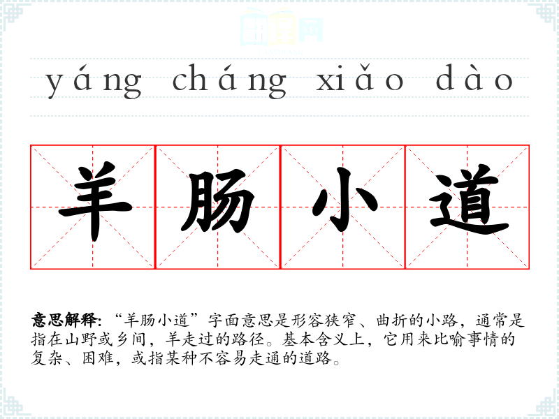 “羊肠小道”字面意思是形容狭窄、曲折的小路,通常是指在山野或乡间,羊走过的路径。基本含义上,它用来比喻事情的复杂、困难,或指某种不容易走通的道路。