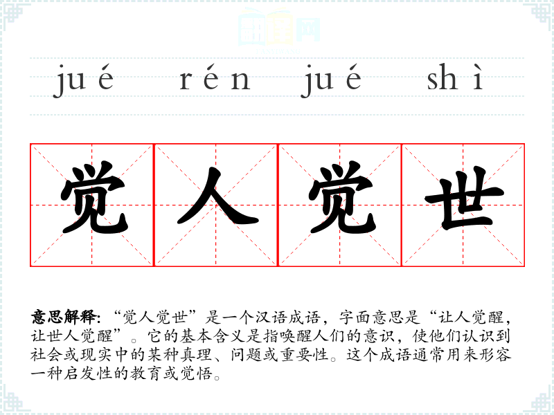 “觉人觉世”是一个汉语成语,字面意思是“让人觉醒,让世人觉醒”。它的基本含义是指唤醒人们的意识,使他们认识到社会或现实中的某种真理、问题或重要性。这个成语通常用来形容一种启发性的教育或觉悟。