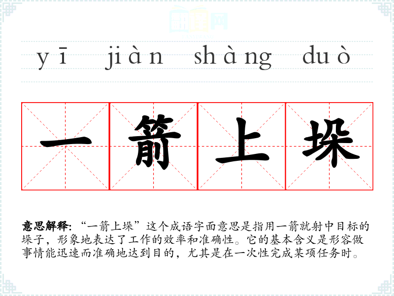 “一箭上垛”这个成语字面意思是指用一箭就射中目标的垛子,形象地表达了工作的效率和准确性。它的基本含义是形容做事情能迅速而准确地达到目的,尤其是在一次性完成某项任务时。