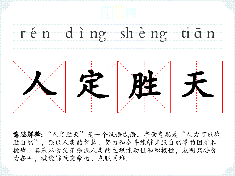 “人定胜天”是一个汉语成语,字面意思是“人力可以战胜自然”,强调人类的智慧、努力和奋斗能够克服自然界的困难和挑战。其基本含义是强调人类的主观能动性和积极性,表明只要努力奋斗,就能够改变命运、克服困难。
