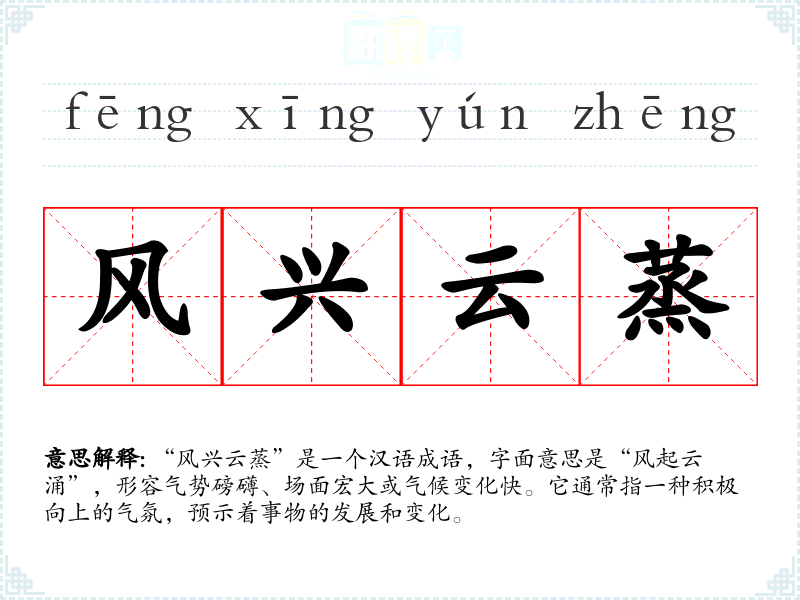 “风兴云蒸”是一个汉语成语,字面意思是“风起云涌”,形容气势磅礴、场面宏大或气候变化快。它通常指一种积极向上的气氛,预示着事物的发展和变化。