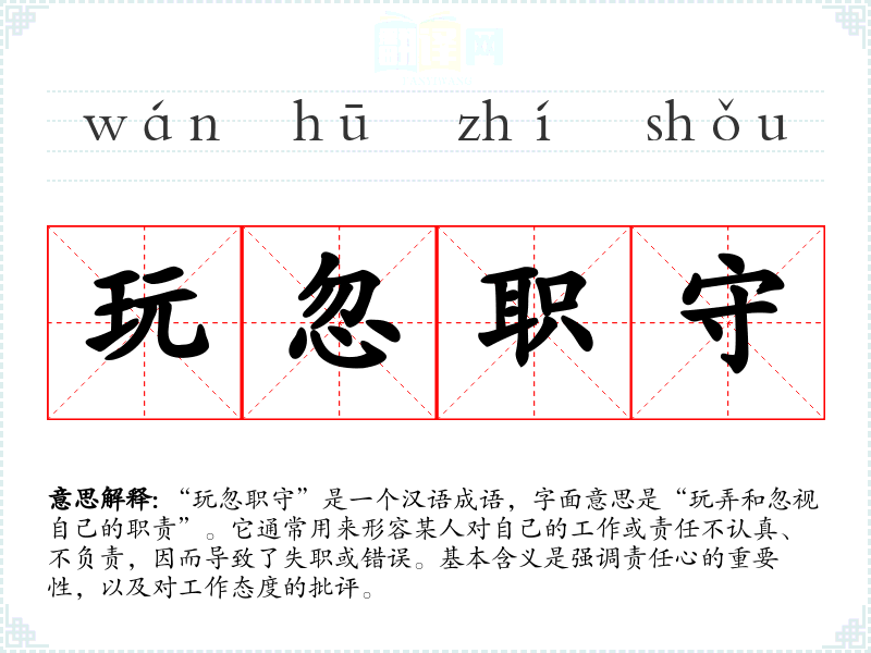 “玩忽职守”是一个汉语成语,字面意思是“玩弄和忽视自己的职责”。它通常用来形容某人对自己的工作或责任不认真、不负责,因而导致了失职或错误。基本含义是强调责任心的重要性,以及对工作态度的批评。