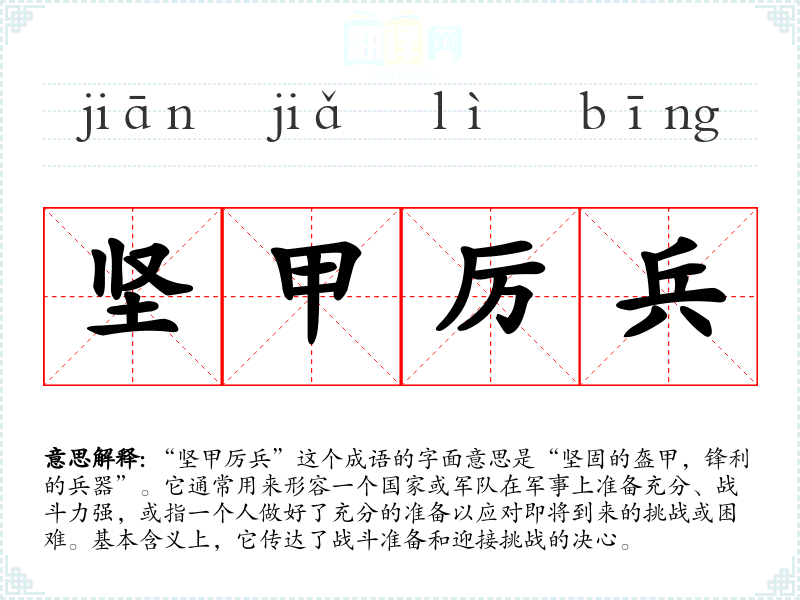 “坚甲厉兵”这个成语的字面意思是“坚固的盔甲,锋利的兵器”。它通常用来形容一个国家或军队在军事上准备充分、战斗力强,或指一个人做好了充分的准备以应对即将到来的挑战或困难。基本含义上,它传达了战斗准备和迎接挑战的决心。