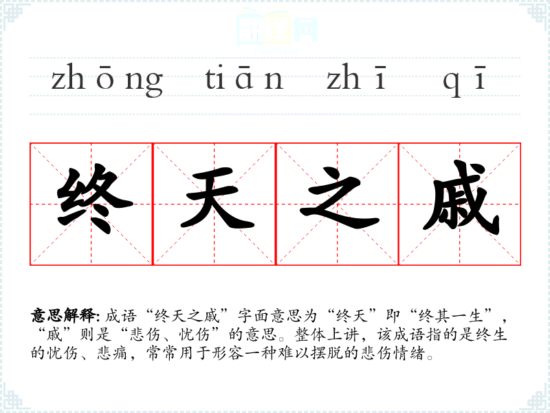 成语“终天之戚”字面意思为“终天”即“终其一生”,“戚”则是“悲伤、忧伤”的意思。整体上讲,该成语指的是终生的忧伤、悲痛,常常用于形容一种难以摆脱的悲伤情绪。