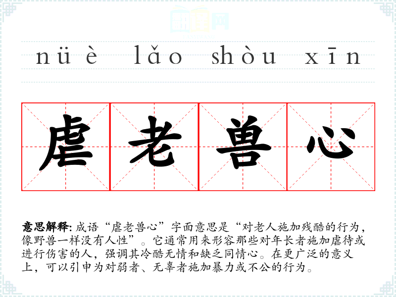成语“虐老兽心”字面意思是“对老人施加残酷的行为,像野兽一样没有人性”。它通常用来形容那些对年**施加虐待或进行伤害的人,强调其冷酷无情和缺乏同情心。在更广泛的意义上,可以引申为对弱者、无辜者施加暴力或不公的行为。