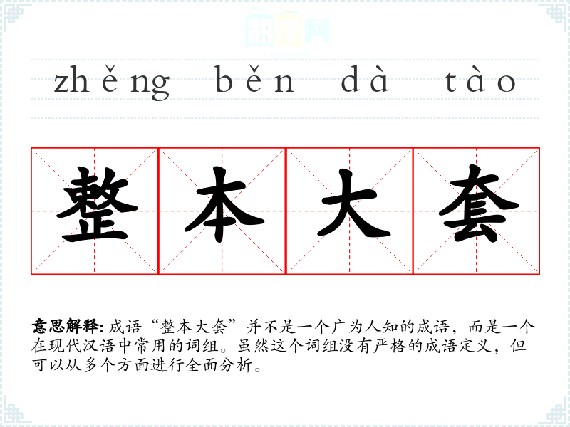 成语“整本大套”并不是一个广为人知的成语,而是一个在现代汉语中常用的词组。虽然这个词组没有严格的成语定义,但可以从多个方面进行全面分析。
