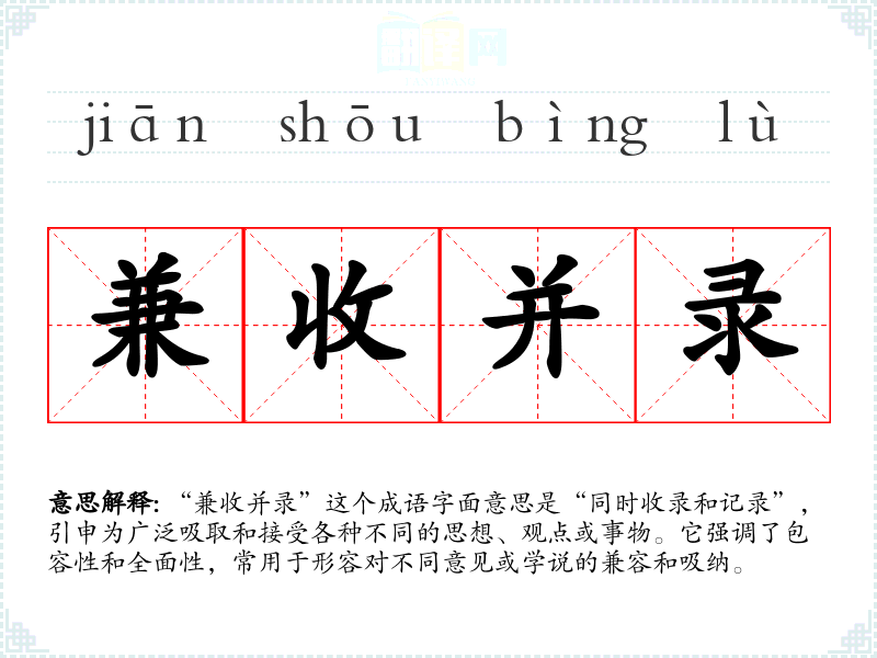 “兼收并录”这个成语字面意思是“同时收录和记录”,引申为广泛吸取和接受各种不同的思想、观点或事物。它强调了包容性和全面性,常用于形容对不同意见或学说的兼容和吸纳。