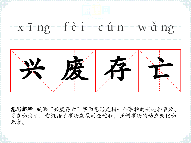 成语“兴废存亡”字面意思是指一个事物的兴起和衰败、存在和消亡。它概括了事物发展的全过程,强调事物的动态变化和无常。
