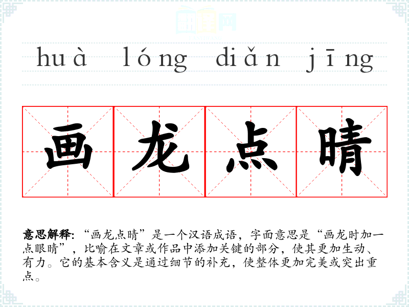“画龙点晴”是一个汉语成语,字面意思是“画龙时加一点眼睛”,比喻在文章或作品中添加关键的部分,使其更加生动、有力。它的基本含义是通过细节的补充,使整体更加完美或突出重点。