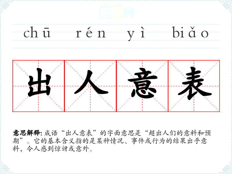 | 出人意表 | 表:外。出乎人们意料之外。 |