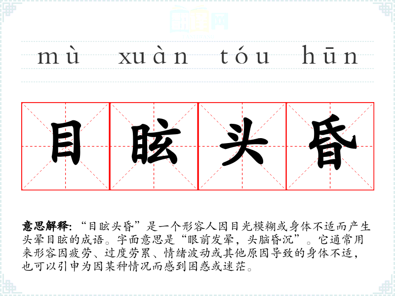 该成语源自古代文献,具体出处并不明确,但在古代文学中常见类似的描述,体现了人们对身体不适状态的关注。成语的构成“目眩”和“头昏”分别指眼睛看东西时感到晕眩和脑袋感到昏沉,体现出一种生理和心理的双重状态。
