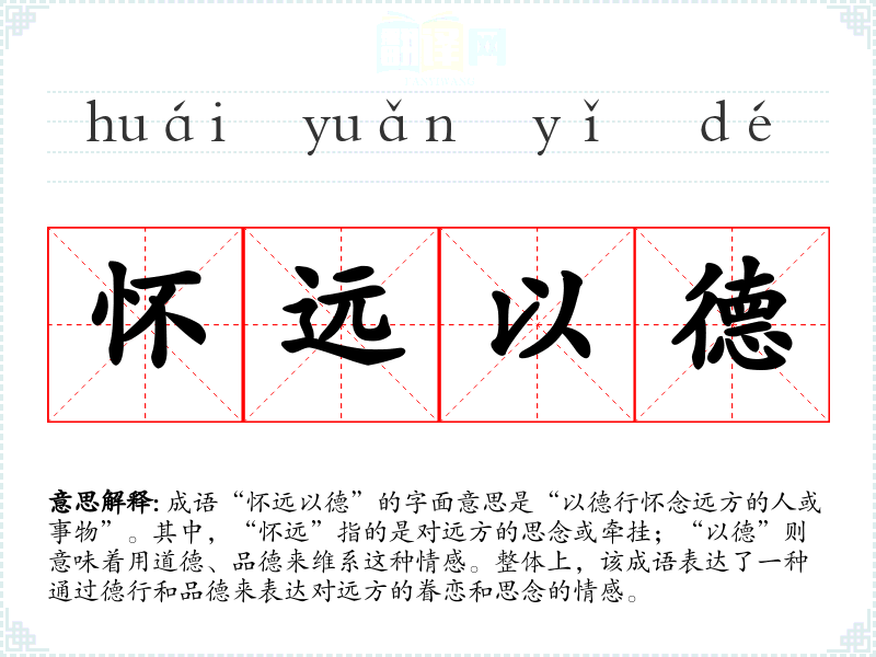 成语“怀远以德”的字面意思是“以德行怀念远方的人或事物”。其中,“怀远”指的是对远方的思念或牵挂;“以德”则意味着用道德、品德来维系这种情感。整体上,该成语表达了一种通过德行和品德来表达对远方的眷恋和思念的情感。