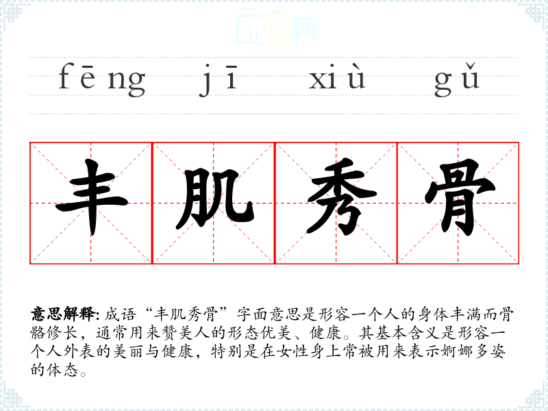 成语“丰肌秀骨”字面意思是形容一个人的身体丰满而骨骼修长,通常用来赞美人的形态优美、健康。其基本含义是形容一个人外表的美丽与健康,特别是在女性身上常被用来表示婀娜多姿的体态。