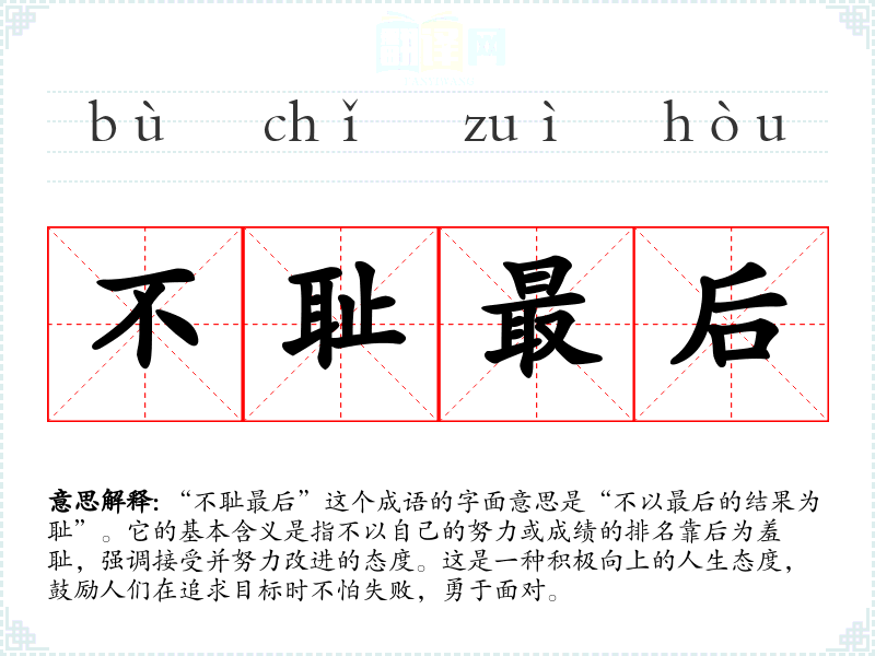 “不耻最后”这个成语的字面意思是“不以最后的结果为耻”。它的基本含义是指不以自己的努力或成绩的排名靠后为羞耻,强调接受并努力改进的态度。这是一种积极向上的人生态度,鼓励人们在追求目标时不怕失败,勇于面对。
