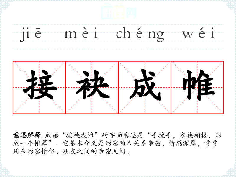 成语“接袂成帷”的字面意思是“手挽手,衣袂相接,形成一个帷幕”。它基本含义是形容两人关系亲密,情感深厚,常常用来形容情侣、朋友之间的亲密无间。