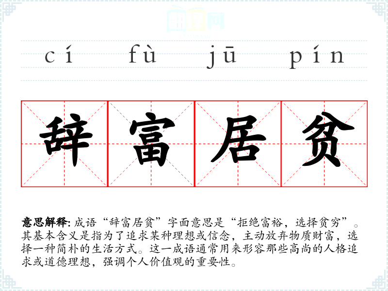 成语“辞富居贫”字面意思是“拒绝富裕,选择贫穷”。其基本含义是指为了追求某种理想或信念,主动放弃物质财富,选择一种简朴的生活方式。这一成语通常用来形容那些高尚的人格追求或道德理想,强调个人价值观的重要性。