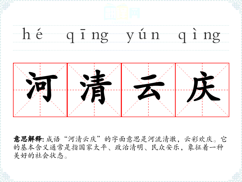 成语“河清云庆”的字面意思是河流清澈,云彩欢庆。它的基本含义通常是指国家太平、政治清明、民众安乐,象征着一种美好的社会状态。