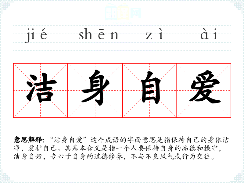 | 洁身自好 | 保持自己纯洁,不同流合污。也指怕招惹是非,只顾自己好,不关心公众事情。 |