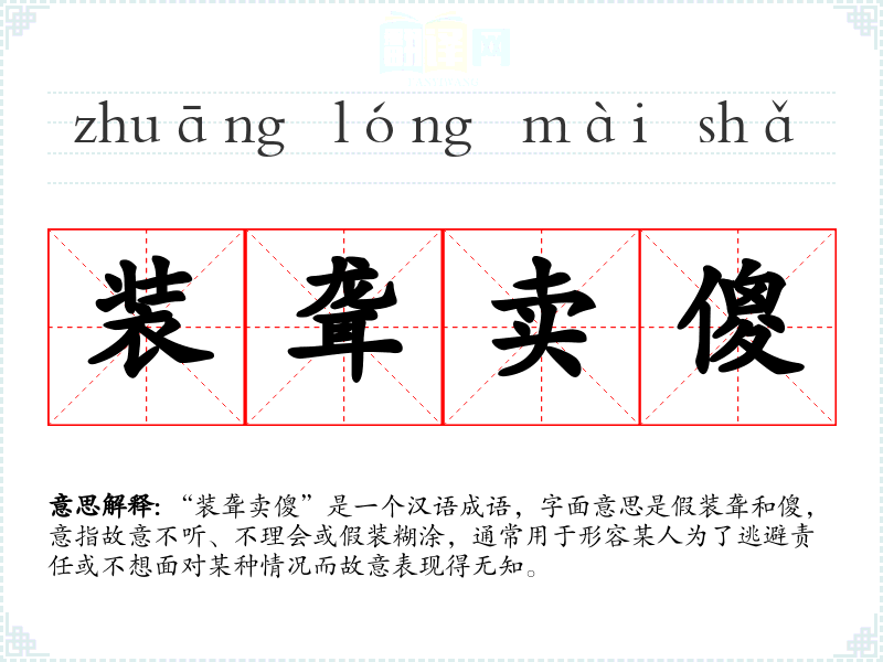 “装聋卖傻”是一个汉语成语,字面意思是假装聋和傻,意指故意不听、不理会或假装糊涂,通常用于形容某人为了逃避责任或不想面对某种情况而故意表现得无知。