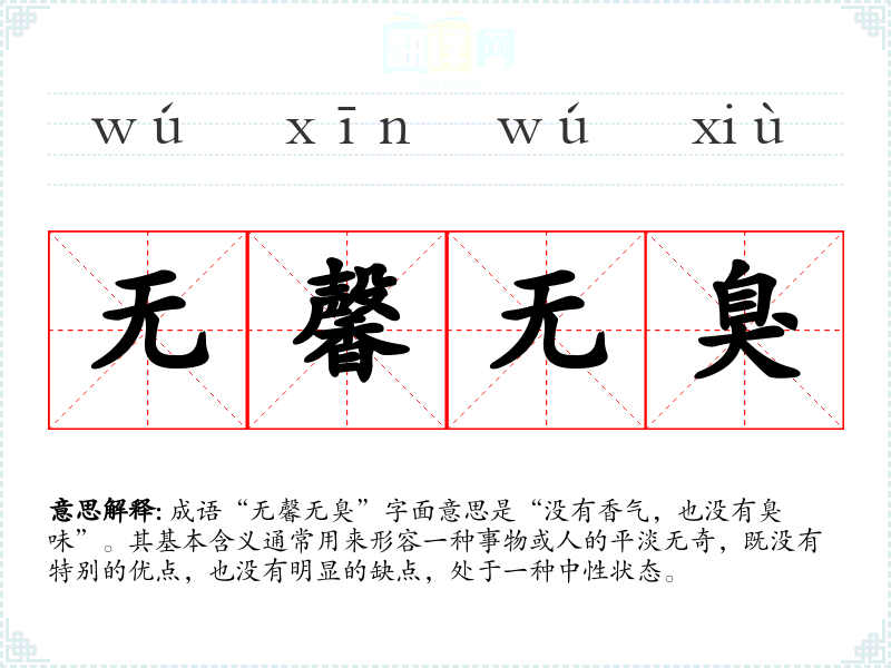 成语“无馨无臭”字面意思是“没有香气,也没有臭味”。其基本含义通常用来形容一种事物或人的平淡无奇,既没有特别的优点,也没有明显的缺点,处于一种中性状态。