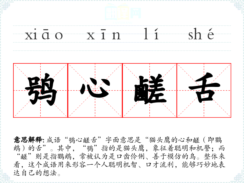 成语“鸮心鹺舌”字面意思是“猫头鹰的心和鹺(即鹦鹉)的舌”。其中,“鸮”指的是猫头鹰,象征着聪明和机警;而“鹺”则是指鹦鹉,常被认为是口齿伶俐、善于模仿的鸟。整体来看,这个成语用来形容一个人聪明机智、口才流利,能够巧妙地表达自己的想法。