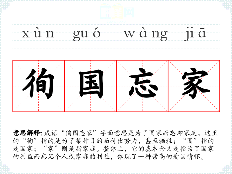 成语“徇国忘家”字面意思是为了国家而忘却家庭。这里的“徇”指的是为了某种目的而付出努力,甚至牺牲;“国”指的是国家;“家”则是指家庭。整体上,它的基本含义是指为了国家的利益而忘记个人或家庭的利益,体现了一种崇高的爱国情怀。