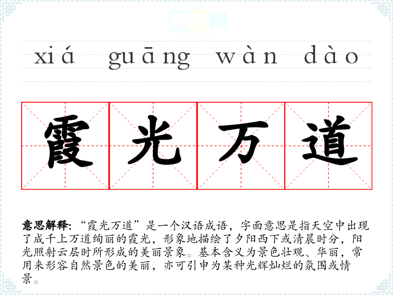 “霞光万道”并没有特定的历史典故或文学出处,但其构成部分“霞光”与“万道”都是常见的汉字词汇,具备较强的诗意表达。类似的表达在古代诗词中较为常见,常用来描绘自然景色和表达诗人的情感。