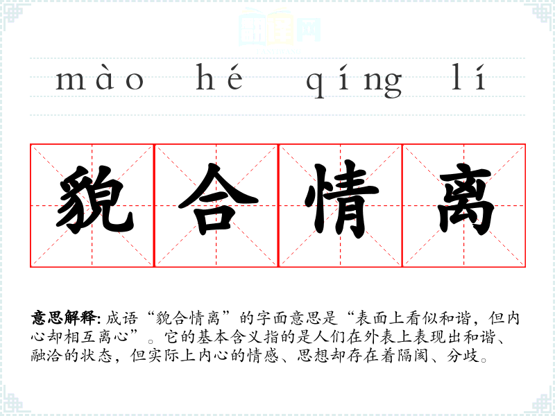 成语“貌合情离”的字面意思是“表面上看似和谐,但内心却相互离心”。它的基本含义指的是人们在外表上表现出和谐、融洽的状态,但实际上内心的情感、思想却存在着隔阂、分歧。