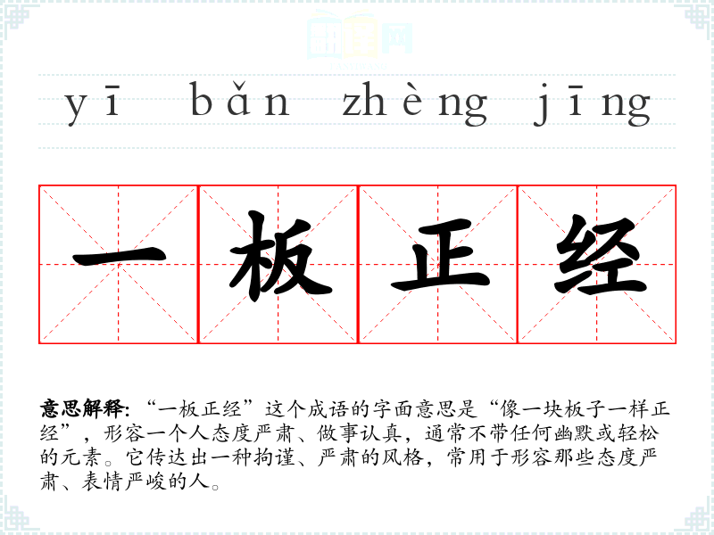 “一板正经”这个成语的字面意思是“像一块板子一样正经”,形容一个人态度严肃、做事认真,通常不带任何幽默或轻松的元素。它传达出一种拘谨、严肃的风格,常用于形容那些态度严肃、表情严峻的人。