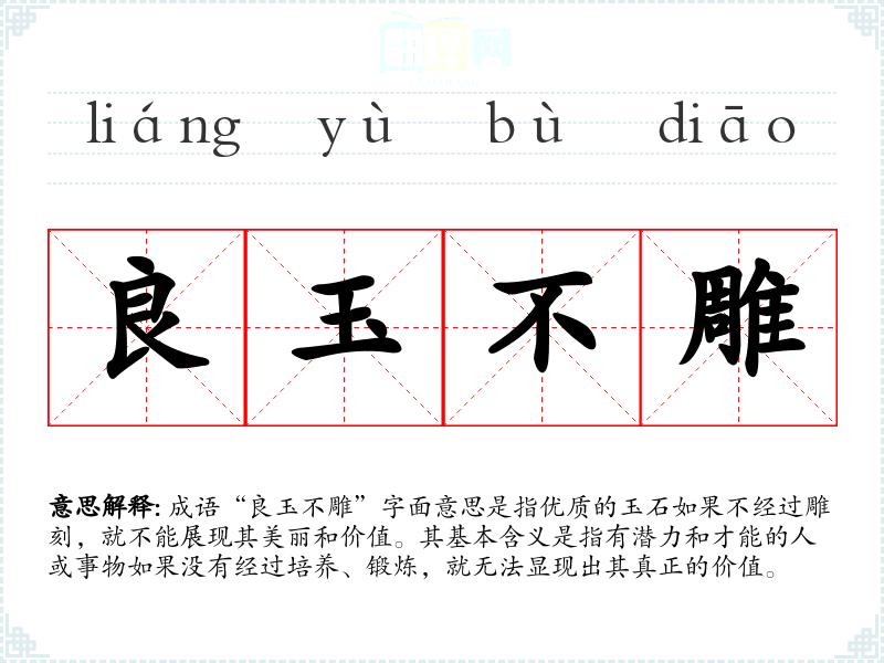 成语“良玉不雕”字面意思是指优质的玉石如果不经过雕刻,就不能展现其美丽和价值。其基本含义是指有潜力和才能的人或事物如果没有经过培养、锻炼,就无法显现出其真正的价值。
