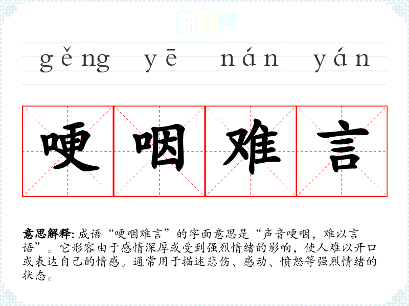 成语“哽咽难言”的字面意思是“声音哽咽,难以言语”。它形容由于感情深厚或受到强烈情绪的影响,使人难以开口或表达自己的情感。通常用于描述悲伤、感动、愤怒等强烈情绪的状态。