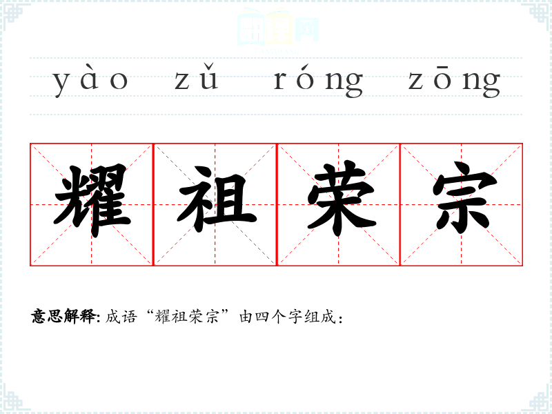 字面意思是通过自己的成就来照耀祖先,带来荣誉给宗族。基本含义指的是为了让祖宗感到自豪,给家族增光添彩。