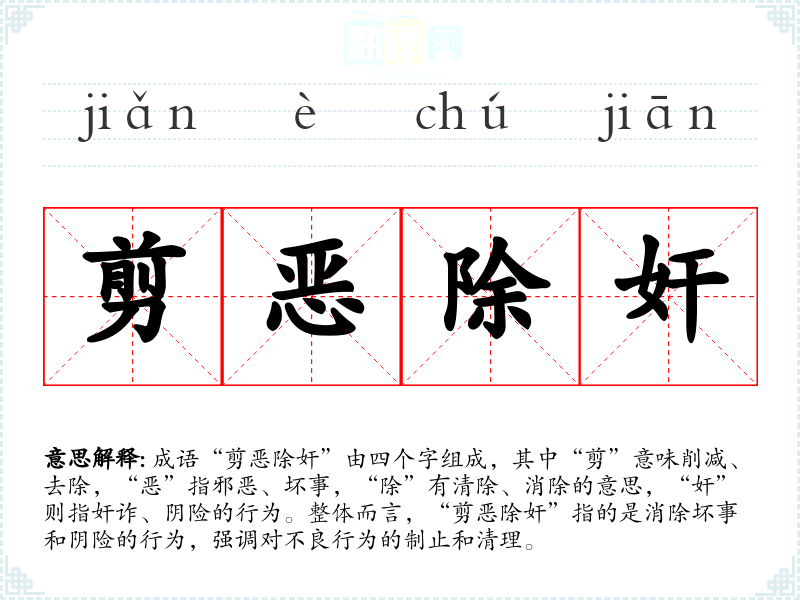成语“剪恶除奸”由四个字组成,其中“剪”意味削减、去除,“恶”指邪恶、坏事,“除”有清除、消除的意思,“奸”则指奸诈、阴险的行为。整体而言,“剪恶除奸”指的是消除坏事和阴险的行为,强调对不良行为的制止和清理。