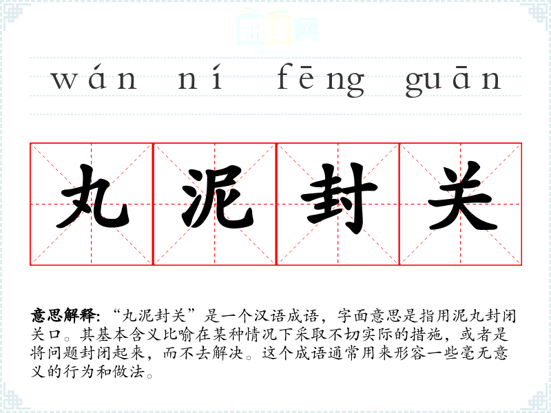 “丸泥封关”是一个汉语成语,字面意思是指用泥丸封闭关口。其基本含义比喻在某种情况下采取不切实际的措施,或者是将问题封闭起来,而不去解决。这个成语通常用来形容一些毫无意义的行为和做法。