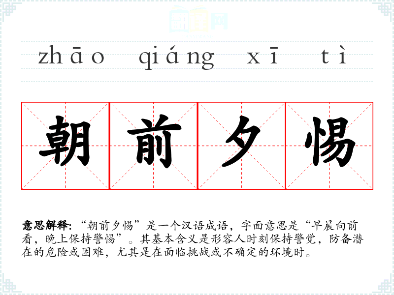 “朝前夕惕”是一个汉语成语,字面意思是“早晨向前看,晚上保持警惕”。其基本含义是形容人时刻保持警觉,防备潜在的危险或困难,尤其是在面临挑战或不确定的环境时。