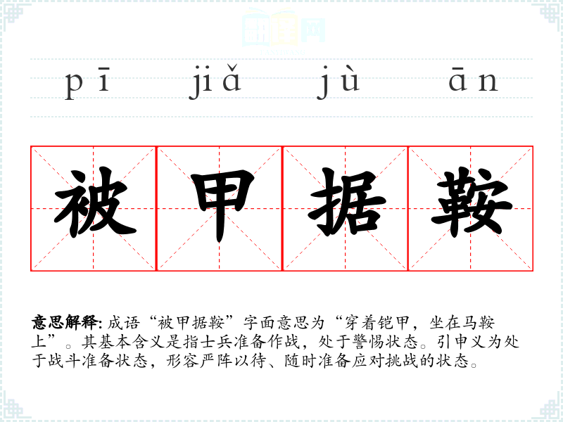 成语“被甲据鞍”字面意思为“穿着铠甲,坐在马鞍上”。其基本含义是指士兵准备作战,处于警惕状态。引申义为处于战斗准备状态,形容严阵以待、随时准备应对挑战的状态。