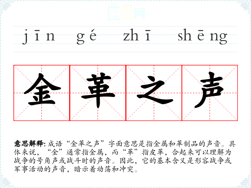 “金革之声”源于古代的军事背景。在历史上,战斗通常伴随着兵器的碰撞声(如金属的金声)和士兵穿着的皮革装备发出的声响。因此,这个成语可以用来形容战争的紧张气氛。在文学作品中,它通常与对战争的描写和对国家命运的反思相关。